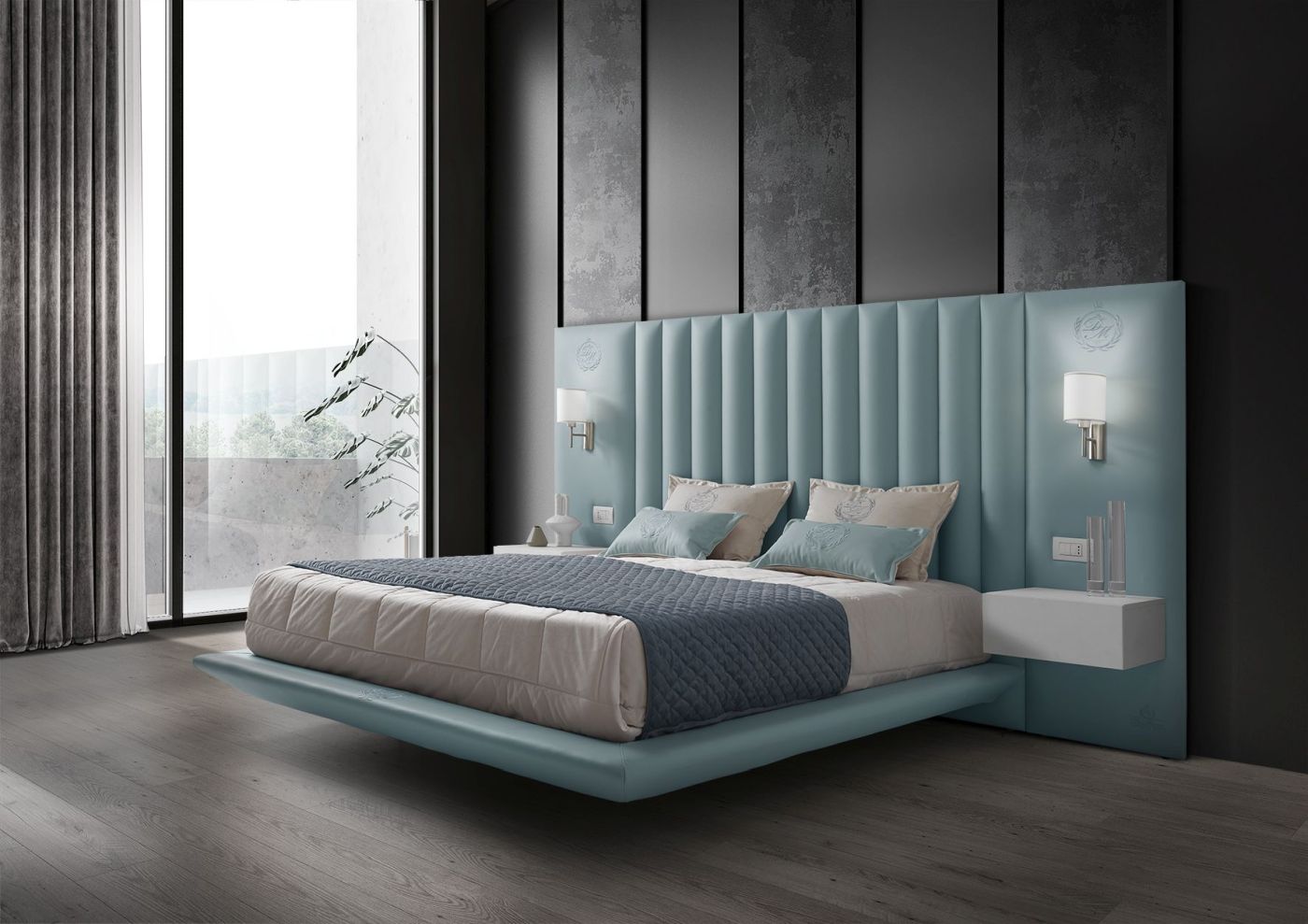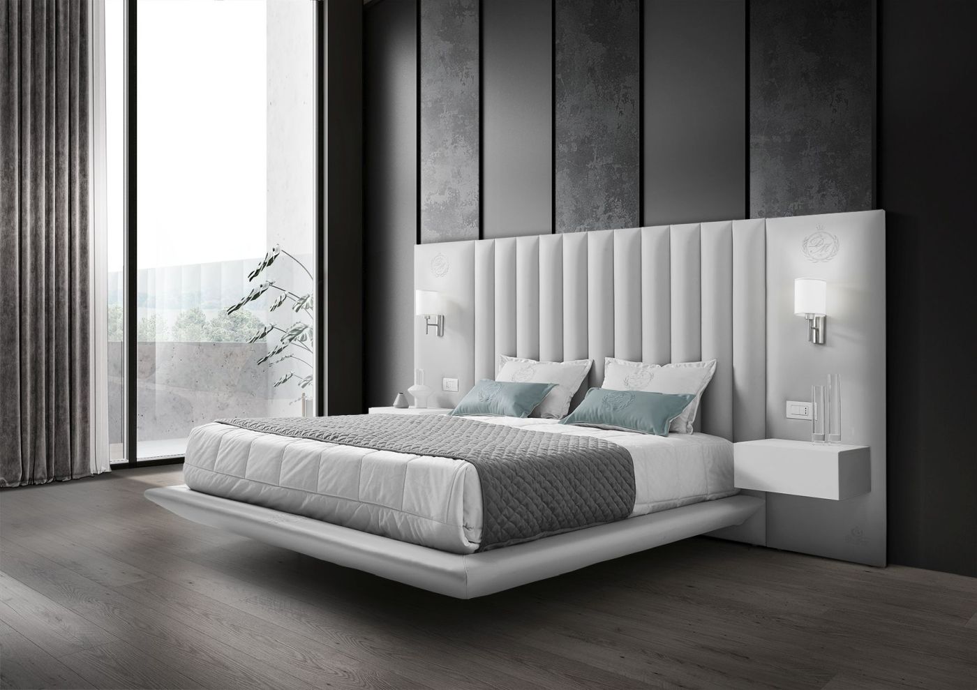 Il piano letto sospeso amplifica la sensazione di leggerezza, mentre i comodini integrati donano funzionalità e continuità visiva.